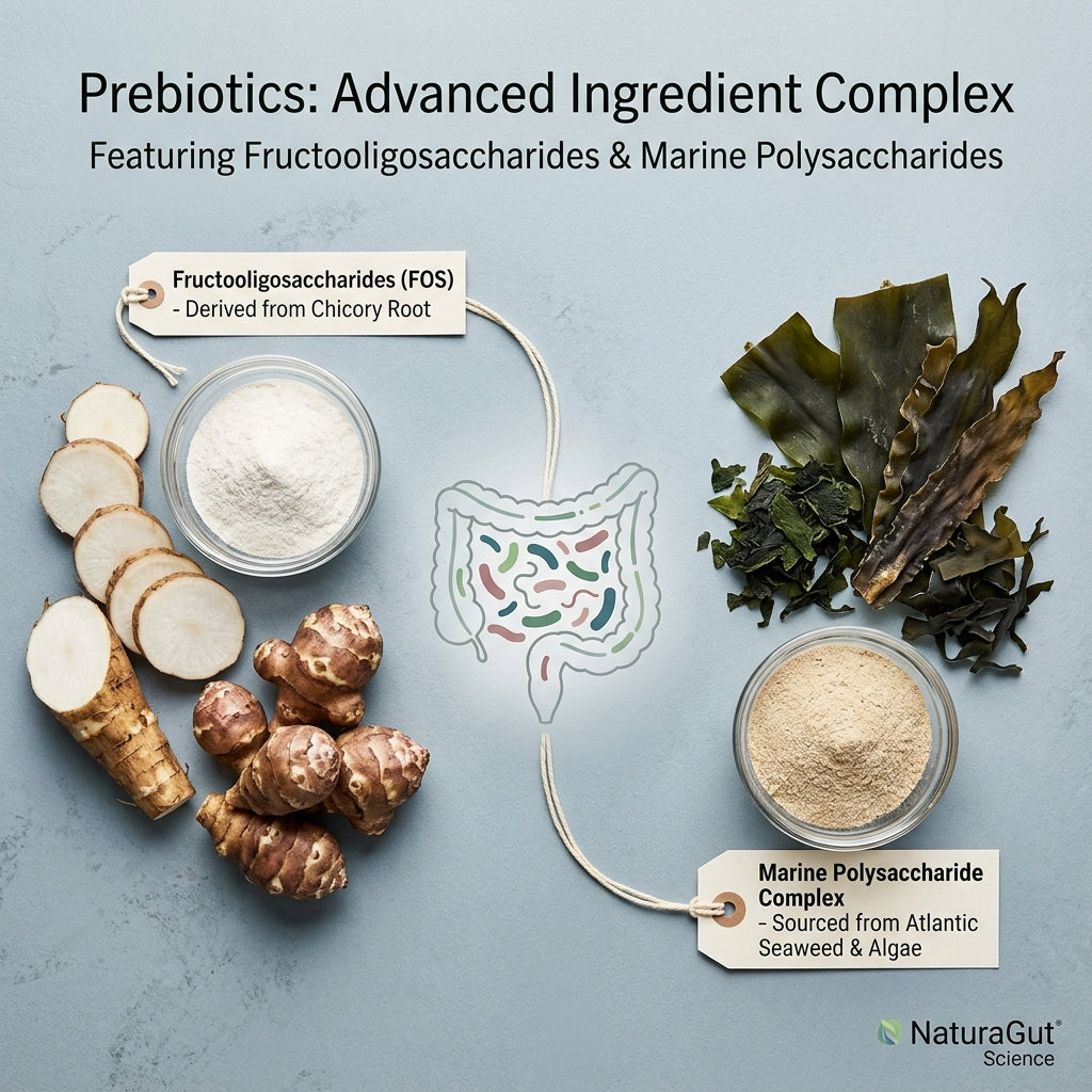 Feeds good bacteria in the gut, supporting their growth and activity. Enhances digestive health, improves gut environment, and supports long-term microbiome balance. Works as nourishment for probiotics, helping them survive and multiply in the gut, ensuring stronger gut flora activity, improved digestion, and better overall gut health and stability.